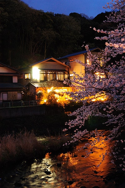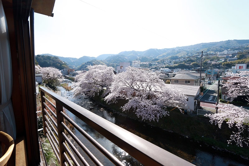 窓からは、四季折々に姿を変える伊豆の山々を一望。松川沿いには桜の木が立ち並び、満開の時季は壮観です。